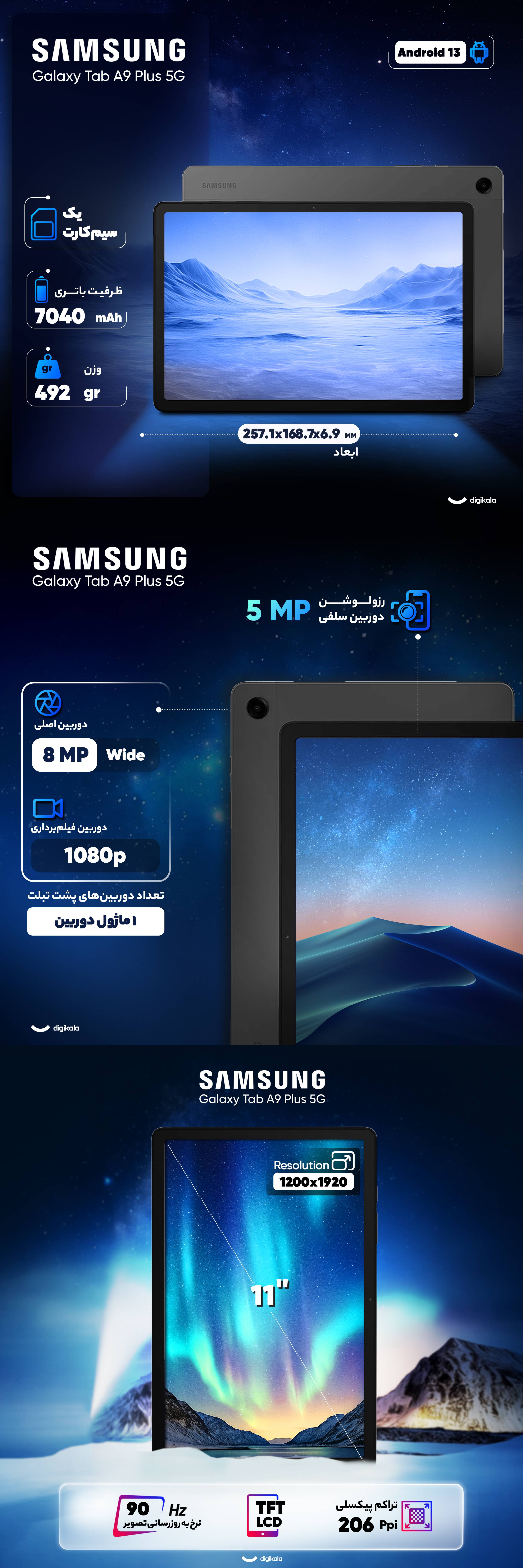 Galaxy Tab A9 Plus 5G با ابعاد 257.1x168.7x6.9 میلیمتر و وزن 492 گرم، طراحی سبک و خوشدست دارد. بدنه فلزی و طراحی باریک، ظاهری مدرن و مستحکم به دستگاه میبخشد. این مدل از یک سیمکارت نانو پشتیبانی میکند و قابلیت تماس صوتی و استفاده از اینترنت همراه را ارائه میدهد. نسبت صفحهنمایش به بدنه 80.9 درصد باعث تجربه دیداری گسترده و کمحاشیه شده است. صفحهنمایش 11 اینچی TFT با رزولوشن 1920x1200 پیکسل و تراکم 206 پیکسل بر اینچ، کیفیت قابل قبول برای تماشای ویدئو، مطالعه و مرور وب ارائه میدهد. نرخ نوسازی 90 هرتز باعث روانتر شدن پیمایش و اجرای بازیها میشود. نسبت تصویر 16:10 و توانایی نمایش 16 میلیون رنگ تجربه بصری رضایتبخش و واقعی را فراهم میکند.
