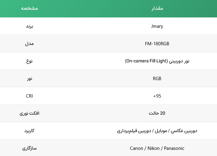 نور ثابت Jmary FM-180RGB یک فیللایت خوشساخت، سبک و قابلحمل است که هم برای عکاسی حرفهای و محصولی کاربرد دارد، هم برای تولید محتوای ویدیویی، استریم و ولاگ.